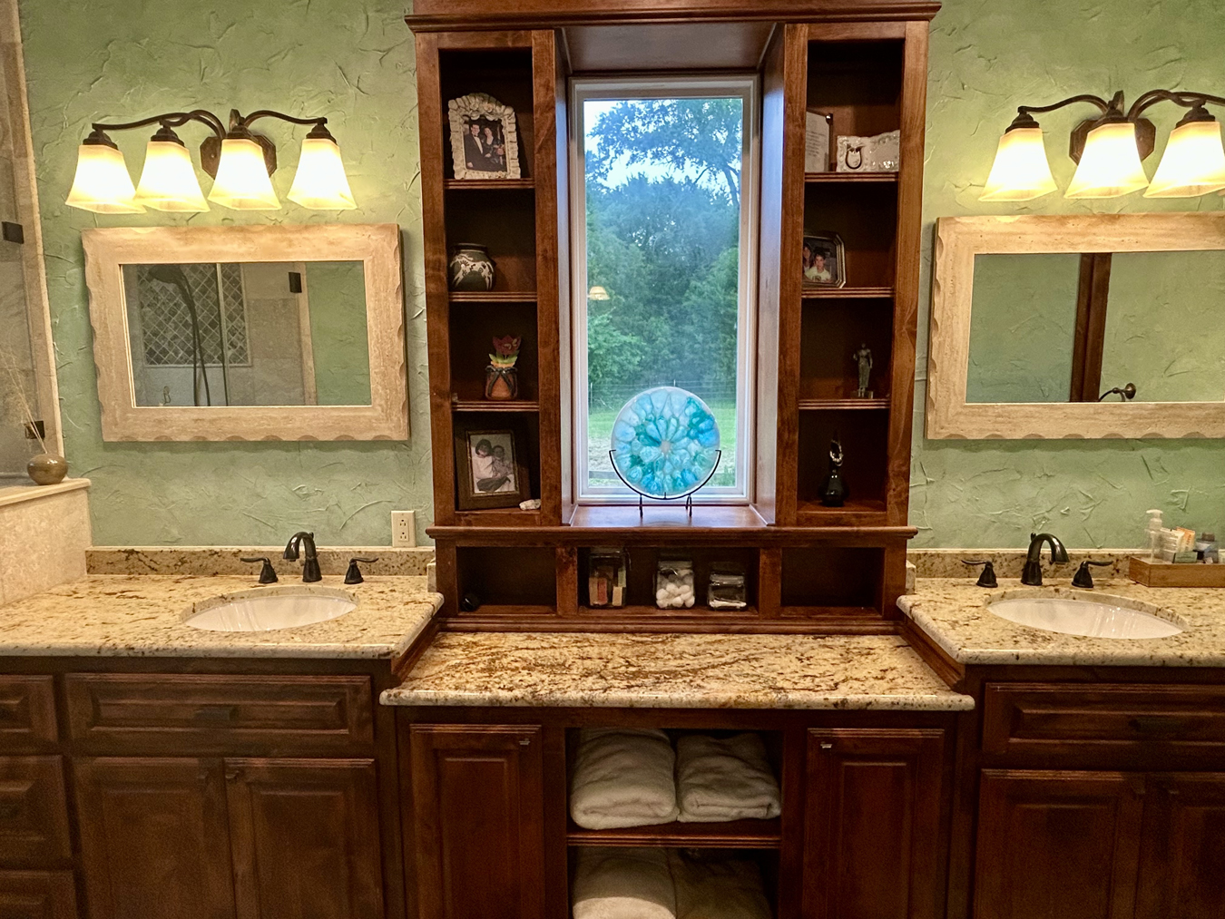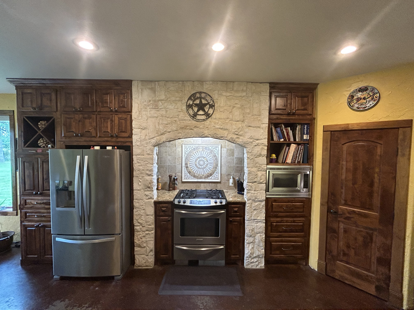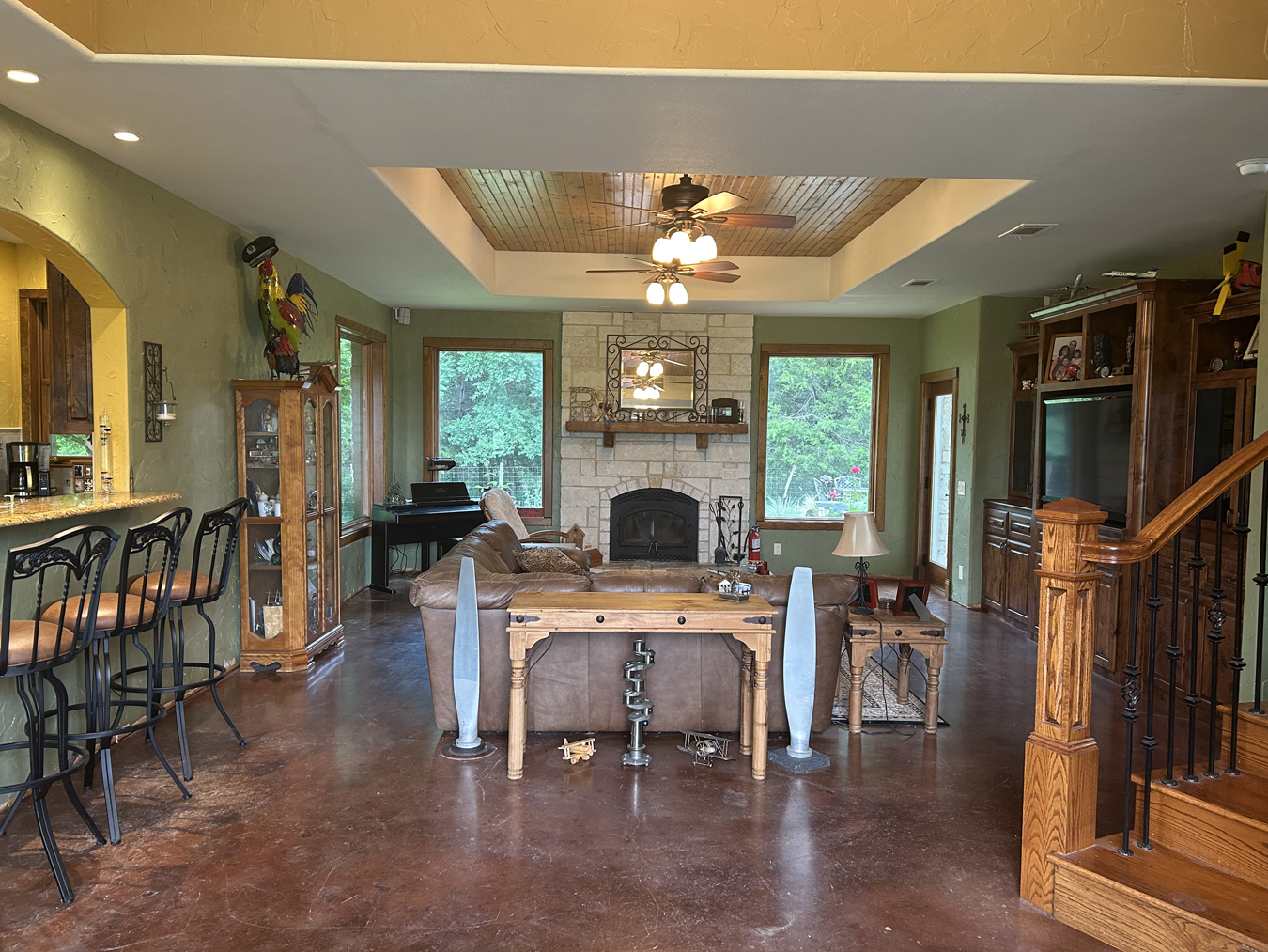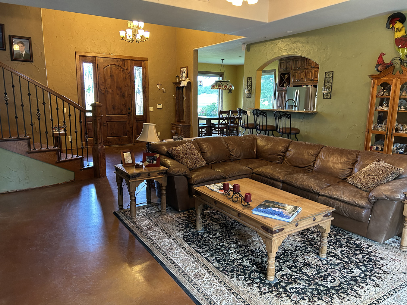 The centerpiece of the property is a highly efficient custom-built stone home with a metal roof, 2x6 walls, foam insulation, Andersen windows, and a geothermal four-zone heating and cooling system. The home also features a tornado closet, safe room and energy recovery ventilator. Additional features include a hot water recirculation system, Heatilator fireplace able to heat the entire home in the winter, granite countertops, and custom knotty alder cabinets and solid knotty alder doors. A surround sound system in the family room is also wired to an outdoor pool sound system for entertainment. With 4 bedrooms, a dedicated office, and a gym, both of which can be converted to additional bedrooms, this home offers comfort and flexibility for a growing family or frequent guests. The house is on an engineered slab with piers and a pier system around the pool shell for longevity.