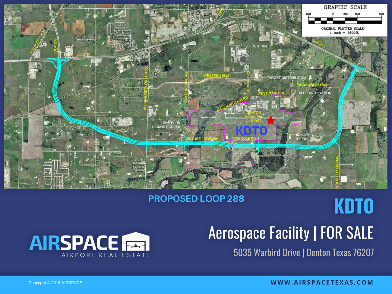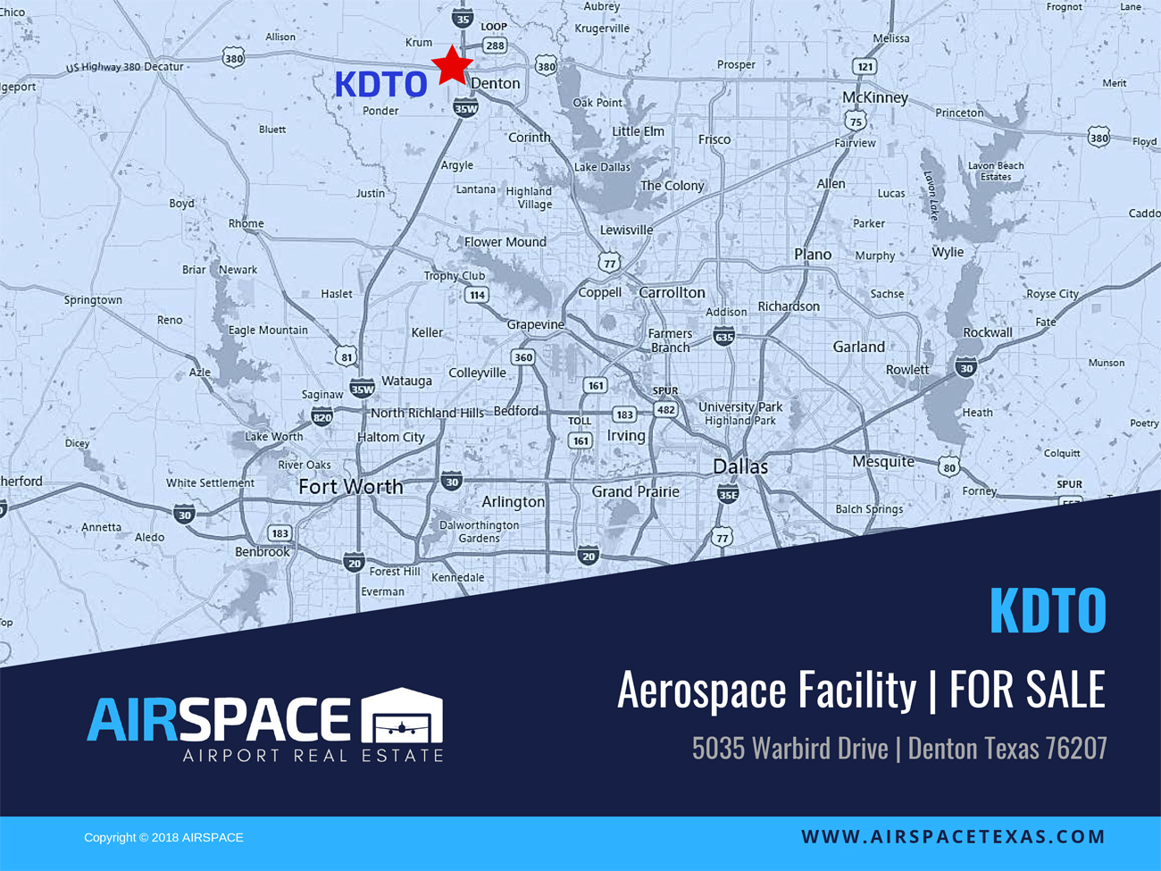 DENTON ENTERPRISE AIRPORT (KDTO) Strategically located at the north intersection of I-35W and I-35E 28 minute drive to Downtown Fort Worth 30 minute drive to Downtown Dallas 25 minute drive to the Plano Corporate Park 15 minute drive to the Texas Motor Speedway.
