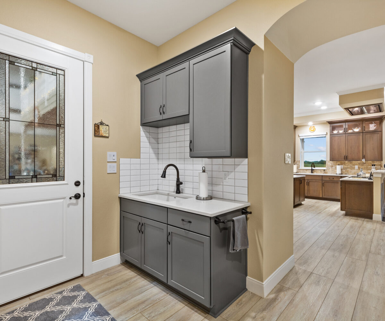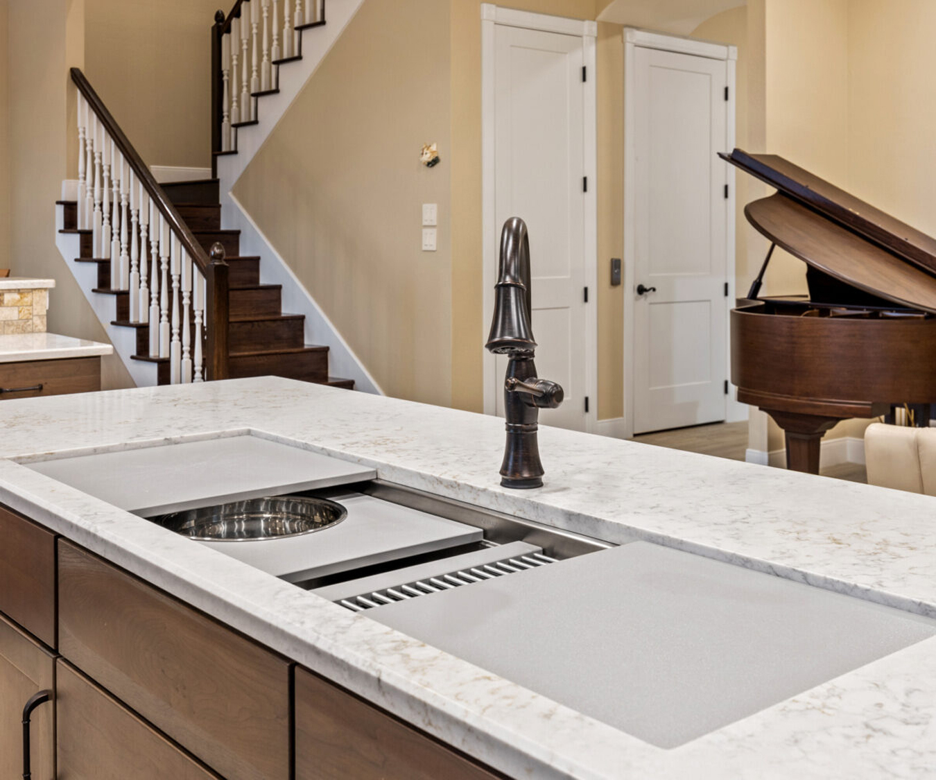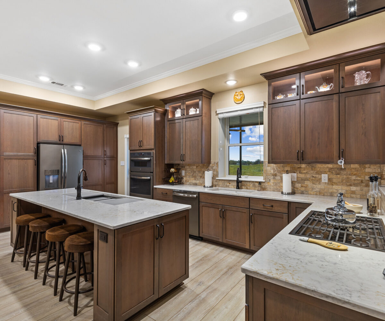 Quartz countertops with travertine back splash, custom all cherry wood cabinetry with pullouts and soft close, 36" Wolf cook top (propane) with custom in ceiling hood vented to the outside, GE profile appliances with dual compressor counter depth refrigerator and 30" built-in combination convection microwave/convection wall ovens, 30" Blanco Silgranit sink, 5' “The Galley” workstation, Delta Touch 2O faucets, Kinetico K5 reverse osmosis drinking water system.