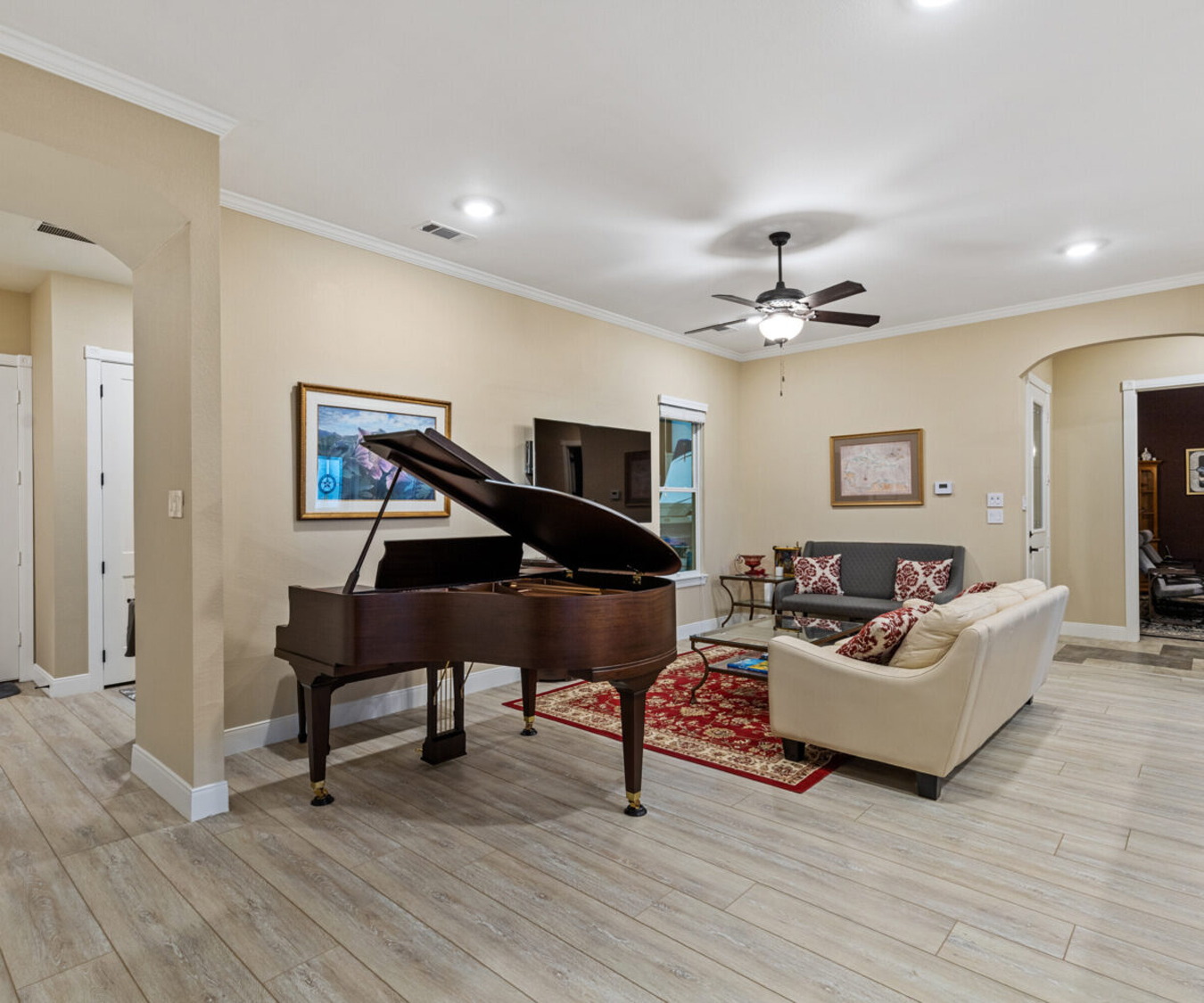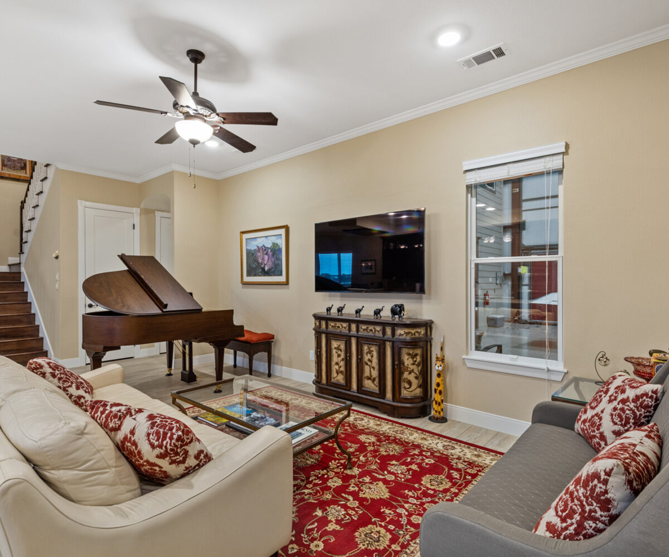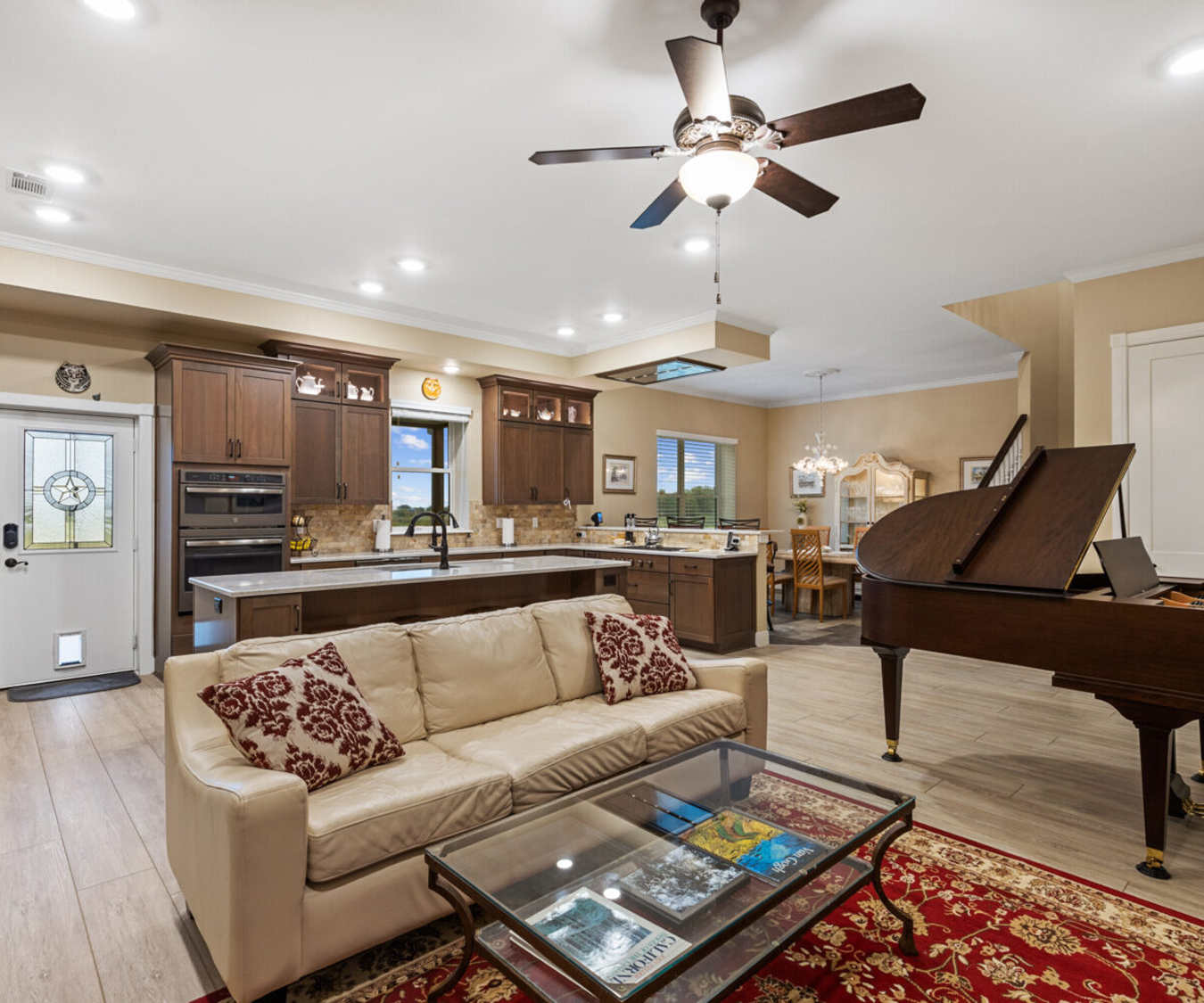 Quartz countertops with travertine back splash, custom all cherry wood cabinetry with pullouts and soft close, 36" Wolf cook top (propane) with custom in ceiling hood vented to the outside, GE profile appliances with dual compressor counter depth refrigerator and 30" built-in combination convection microwave/convection wall ovens, 30" Blanco Silgranit sink, 5' “The Galley” workstation, Delta Touch 2O faucets, Kinetico K5 reverse osmosis drinking water system.