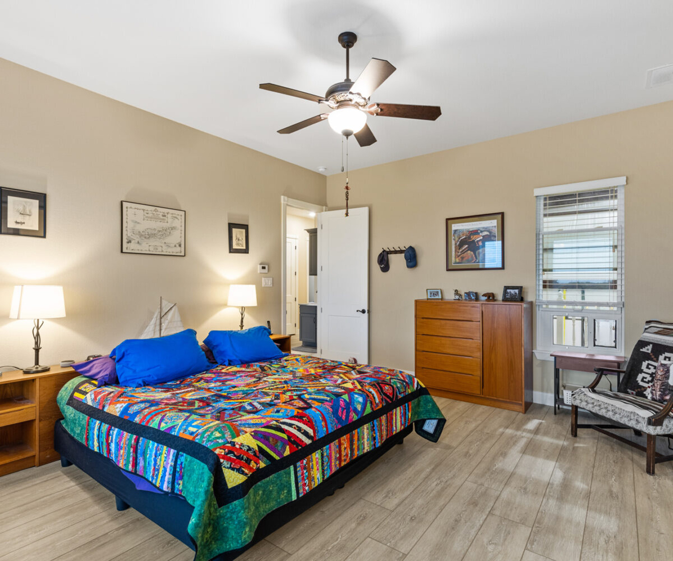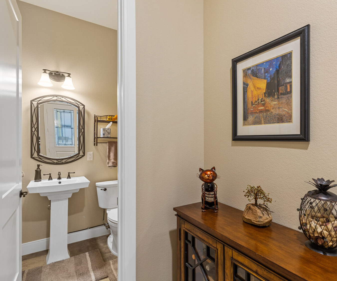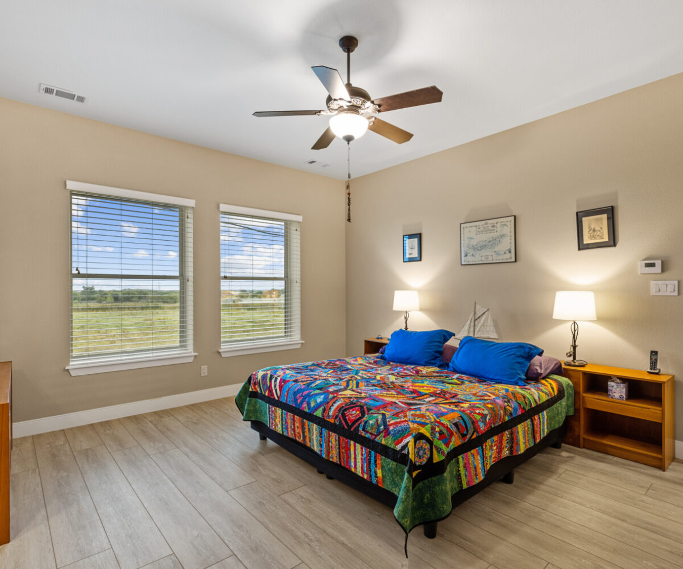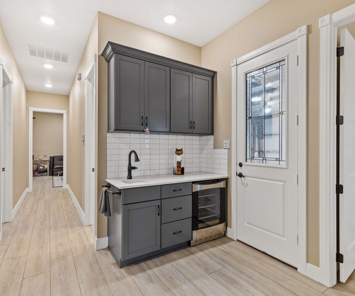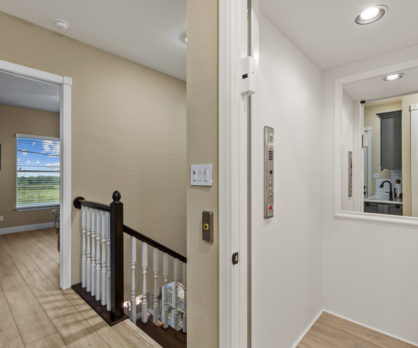 3 bedrooms with additional bonus/game room (or 4th bedroom) and media room; 2 full baths (with double vanity sinks) and 2 half baths; mud room with 30" Blanco Silgranit sink, Delta Touch2O faucet, and quartz countertop; utility room for washer and dryer; 276 sq ft mezzanine with remote controlled infrared heating; large residential elevator; walk-in closets in bedrooms; Shaw luxury vinyl flooring throughout; double pane – double hung windows; 8’0" fiberglass doors; LED lighting (dimmable) with some smart switches; 10' ceilings; upgraded ceiling fans; Trane heat pump HVAC with three zones; wet bar next to mezzanine with Blanco Silgranit bar sink, quartz countertop and beverage refrigerator.