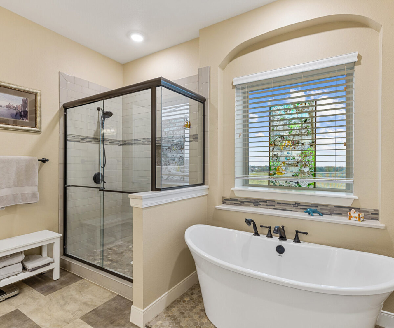 Quartz countertops with dual sinks in full baths, tiled showers with travertine tile floors, Delta H2O Kinetic shower fixtures, American Standard Champion 4 right height toilets, three Brondell bidet toilet seats with remote controls, standalone soaker tub in master bath.